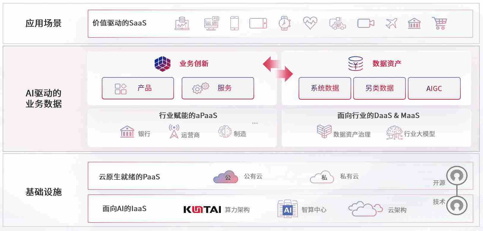 数字时代,,,围绕企业数字化转型的关键要素,,杏悦2数码开创性的提出数云融合战略和技术体系框架,,着力在云原生、、数字原生、、AI原生和信创产业上架构产品和服务能力,,,,为处在不同数字化转型阶段的快消零售、、、汽车、、金融、、、、医疗、、、政企、、教育、、运营商等行业客户提供泛在的敏捷IT能力和融合的数据驱动能力,,构建跨界融合创新的数字业务场景和新业务模式,,助力企业级客户建立面向未来的核心能力和竞争优势,,全面推动社会的数字化、、、智能化转型升级。。。。