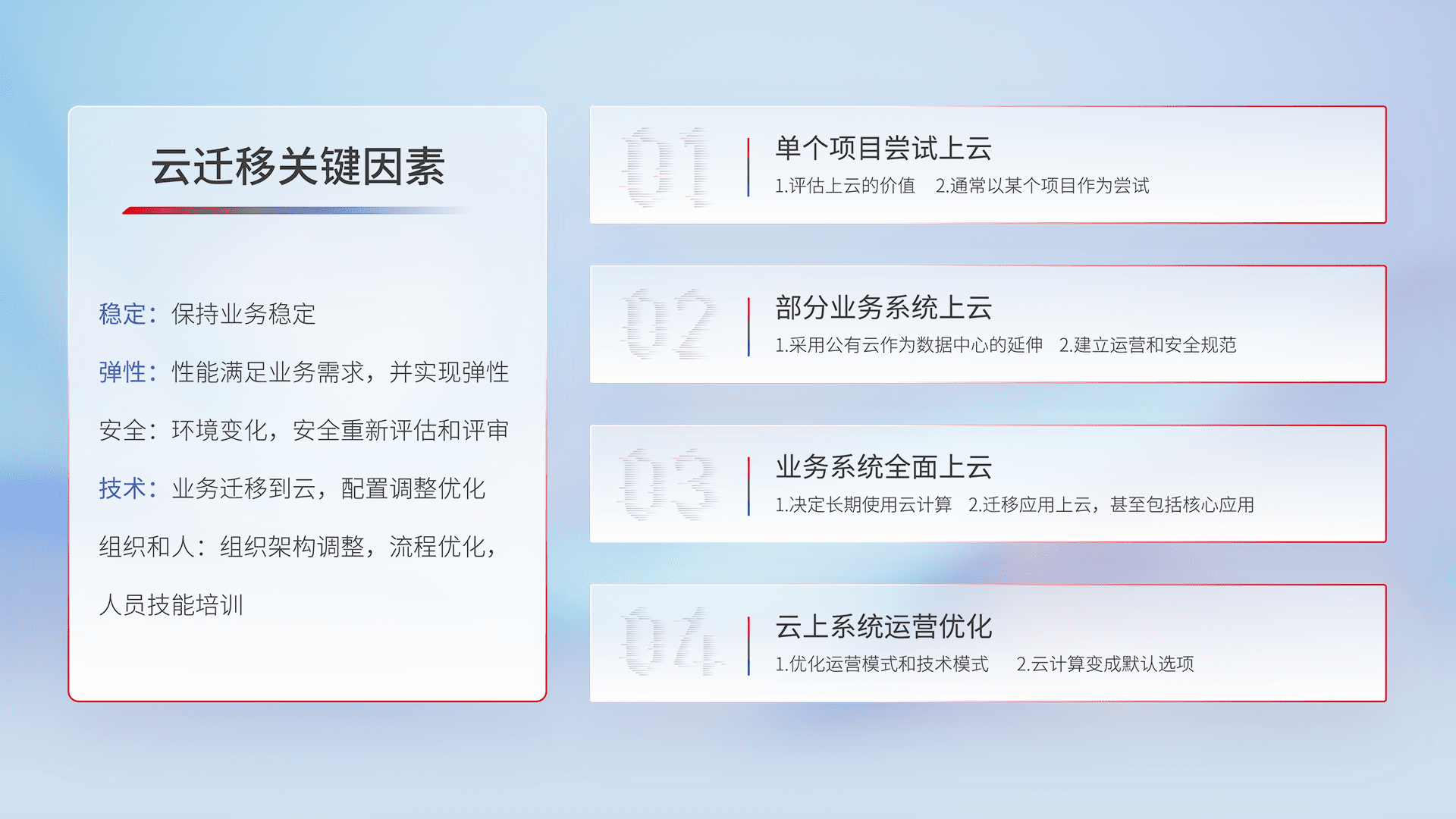 结合实际业务,,,,从规划设计、、、云平台选型、、、、云原生改造、、、、数据迁移、、集成交付,,,,迁移全过程为客户识别最佳上云路径,,做好风险识别管理,,设计网络架构、、、、身份权限、、、安全审计合规、、操作审计、、日志审计、、监控告警策略、、、多站点容灾设计等,,,对云上基础设施进行整体规划,,,,提升IT治理水平,,,以满足弹性、、高可用、、高性能的需求。。。。