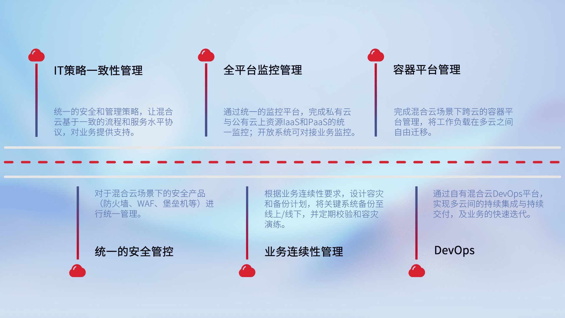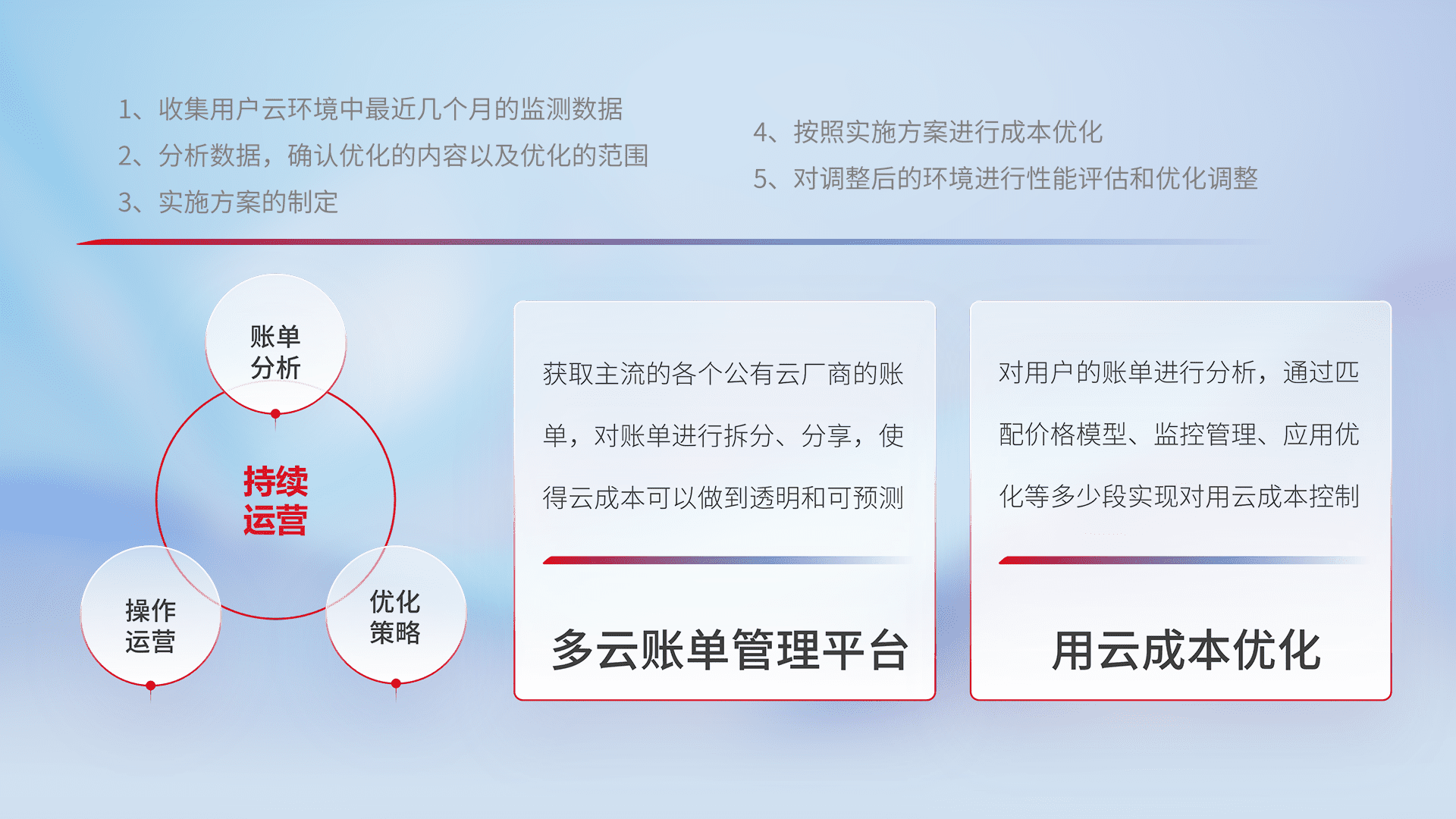 通过多云纳管,,,,以统一的资源数据模型把客户的云资源进行抽象和封装,,进而实现对多云资源的统一操作,,,,保障云资源管理的可靠性、、、稳定性与可用性。。量身定制化运维内容,,配置、、开发运维、、补丁管理、、备份、、、监控、、、、认证和访问管理、、、审计和日常巡检等,,保障在用云过程中的可靠度,,,,稳定度以及高可用率。。
